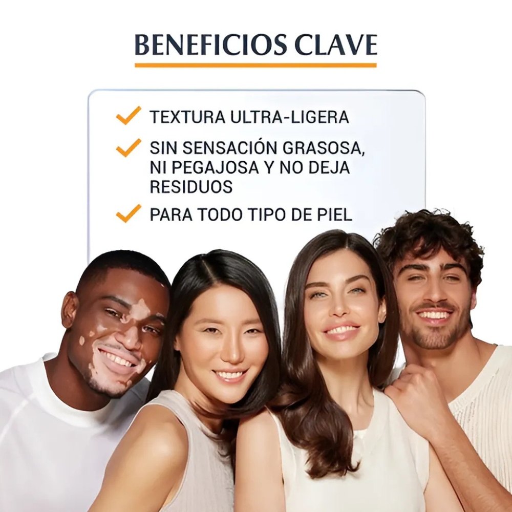 Eucerin Sun Face Hydro Fluid Textura Ultra Ligera FPS50+ combina filtros UVA/UVB para una protección del antioxidante Lichocalcona A, que ayuda a la neutralización de los radicales libres generados por los rayos UV y Luz Visible de alta energía (HEVIS) junto con el Ácido Glicirretínico. Además ayuda a proteger la piel se quemaduras solares y reducir el daño en la piel inducido por el sol.